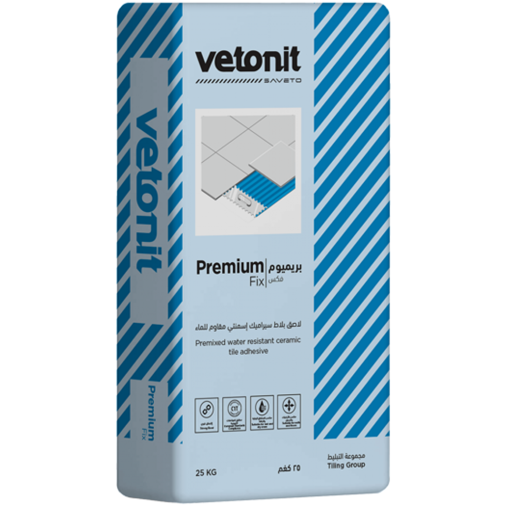 Premium Fix is a normal cementitious adhesive for ceramic tiles with slip-resistance properties (as per ISO-13007-1 class C1 T description). The material is composed of hydraulic binders, selected aggregates, and special additives. It is supplied as a dry powder in pre-weighed bags ready to use on-site, requiring only the addition of clean water to produce an easily workable mortar. Premium Fix is ideal for fixing ceramic and terrazzo tiles. It should be applied at a thickness of 3 - 10 mm, depending on the substrate's type and the quality of the tiles.